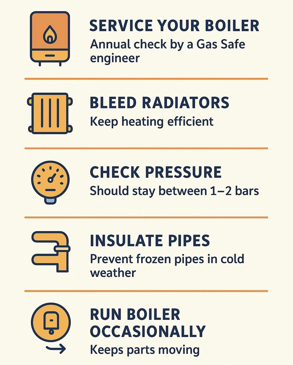 Even if you’re away or don’t need the heating, run your boiler for 10–15 minutes every few weeks. This keeps parts moving and prevents seizing.